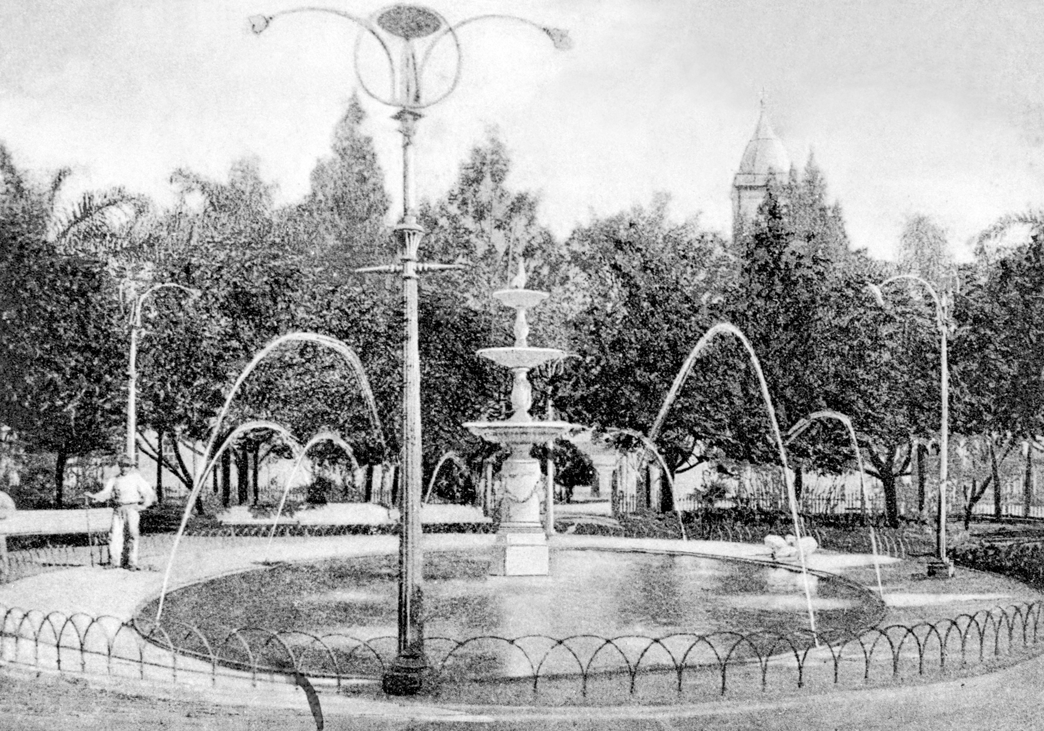 Iconografia, em preto e branco do chafariz (não mais em funcionamento), existente na Praça José Bonifácio, no centro de Piracicaba. Não informações de datação e procedência.