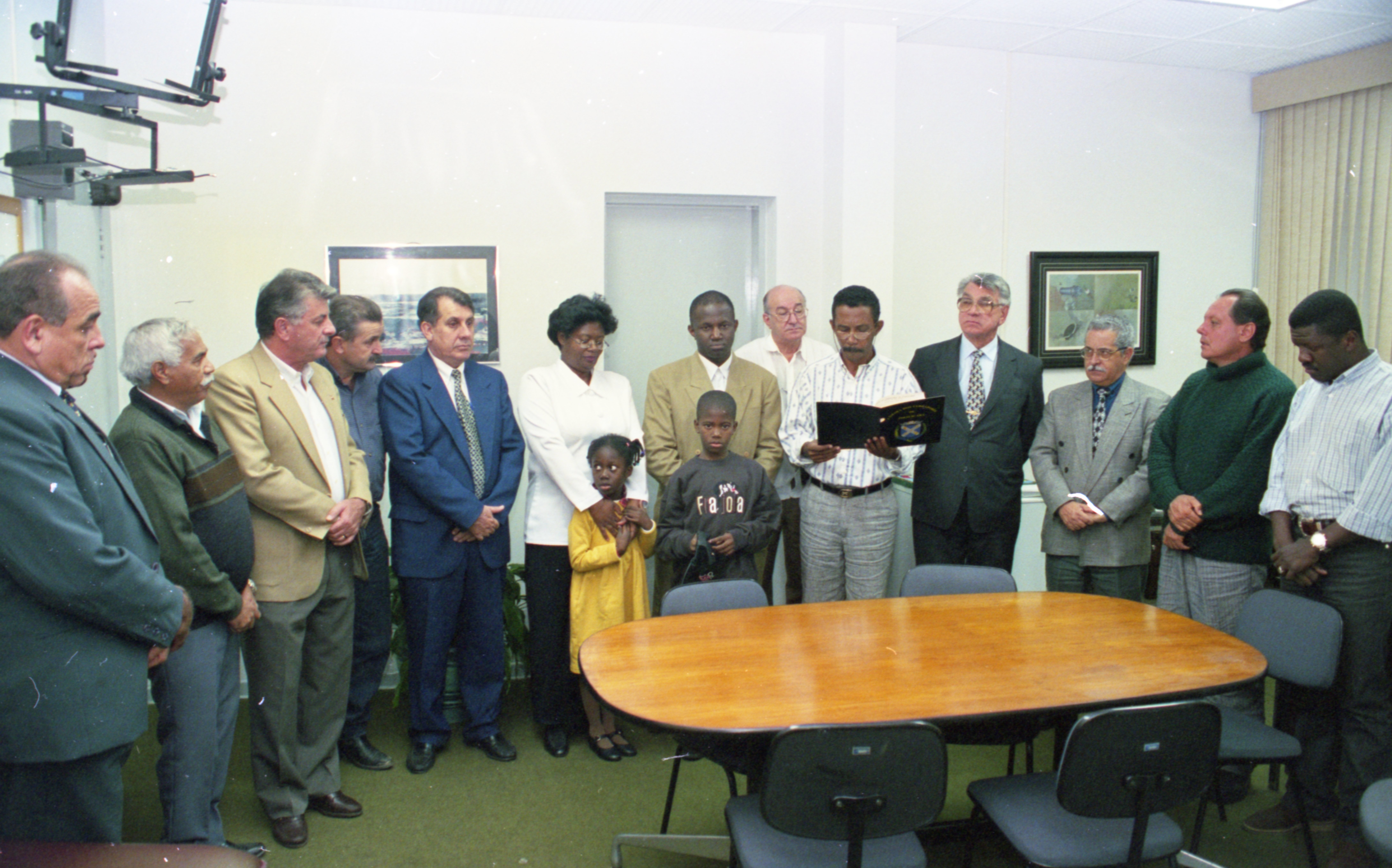 Iconografia que registra a entrega da Moção de Aplausos nº079/1999 ao Doutor Antônio Ananias Filho, Chefe da UTI Neonatal da Santa Casa de Misericórdia de Piracicaba, e sua equipe, pelo brilhante serviço que desenvolvem naquela unidade. A entrega teve lugar na Câmara Municipal de Piracicaba, com a presença do vereador João Manoel dos Santos, autor da propositura, e de outros membros da edilidade.