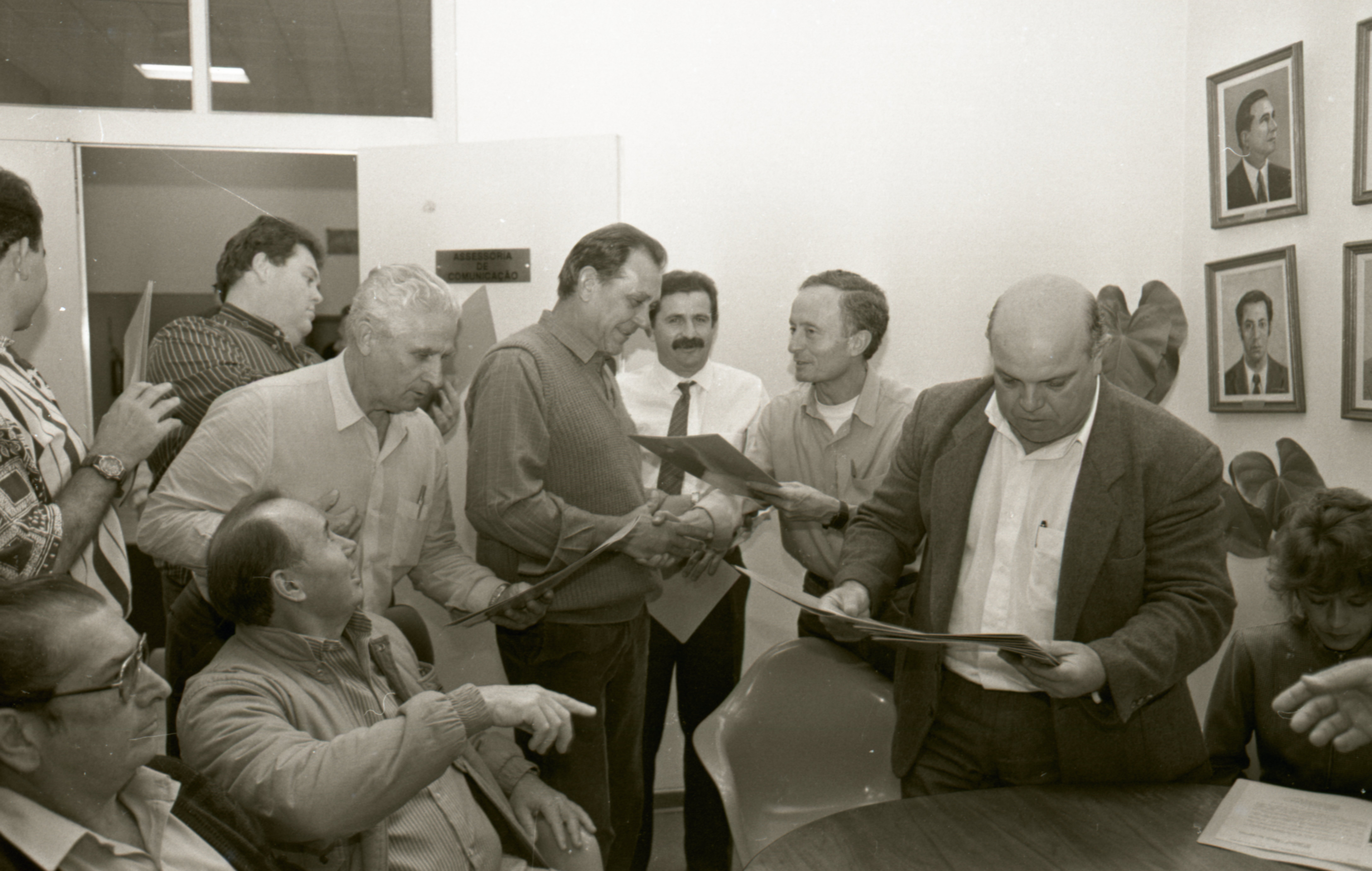 Iconografia que registra a entrega da Moção de Aplausos nº 93/1995, à comitiva da I Navegação do Mercosul, comandada por José Luiz Guidotti. A entrega foi realizada na então sala de reuniões dos vereadores e contou com a presença do vereador Egídio Mauro Filho, autor da propositura, e outros membros da edilidade como: Ademar Luciano Junior, Guido Negri, Roberto Turchi de Morais, José Pedro Leito (Zé Pedro) e Juan Sebastianes.