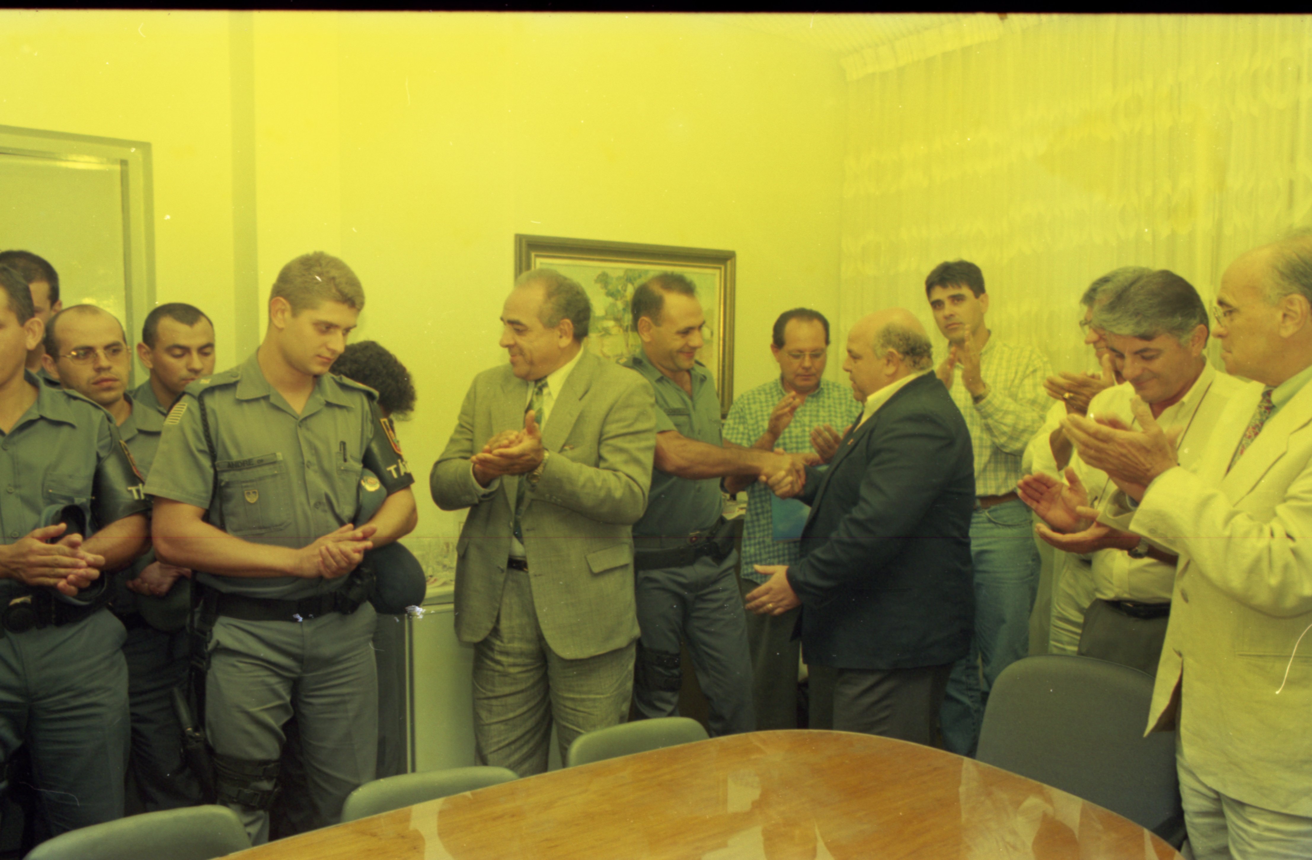 Iconografia que registra a entrega da Moção de Aplausos nº309/1997 ao Capitão Costa e sua equipe pelo excelente trabalho realizado na cidade de Rio das Pedras. A entrega teve lugar na então sala de reunião dos vereadores, com a presença do vereador João Leite de Oliveira, autor da propositura, e de outros membros da edilidade, como: José Aparecido Longatto, Egídio Mauro Filho, Ary de Camargo Pedroso Junior, Jorge Rodrigues Martins, Antônio Oswaldo Storel e Nelson Corder.