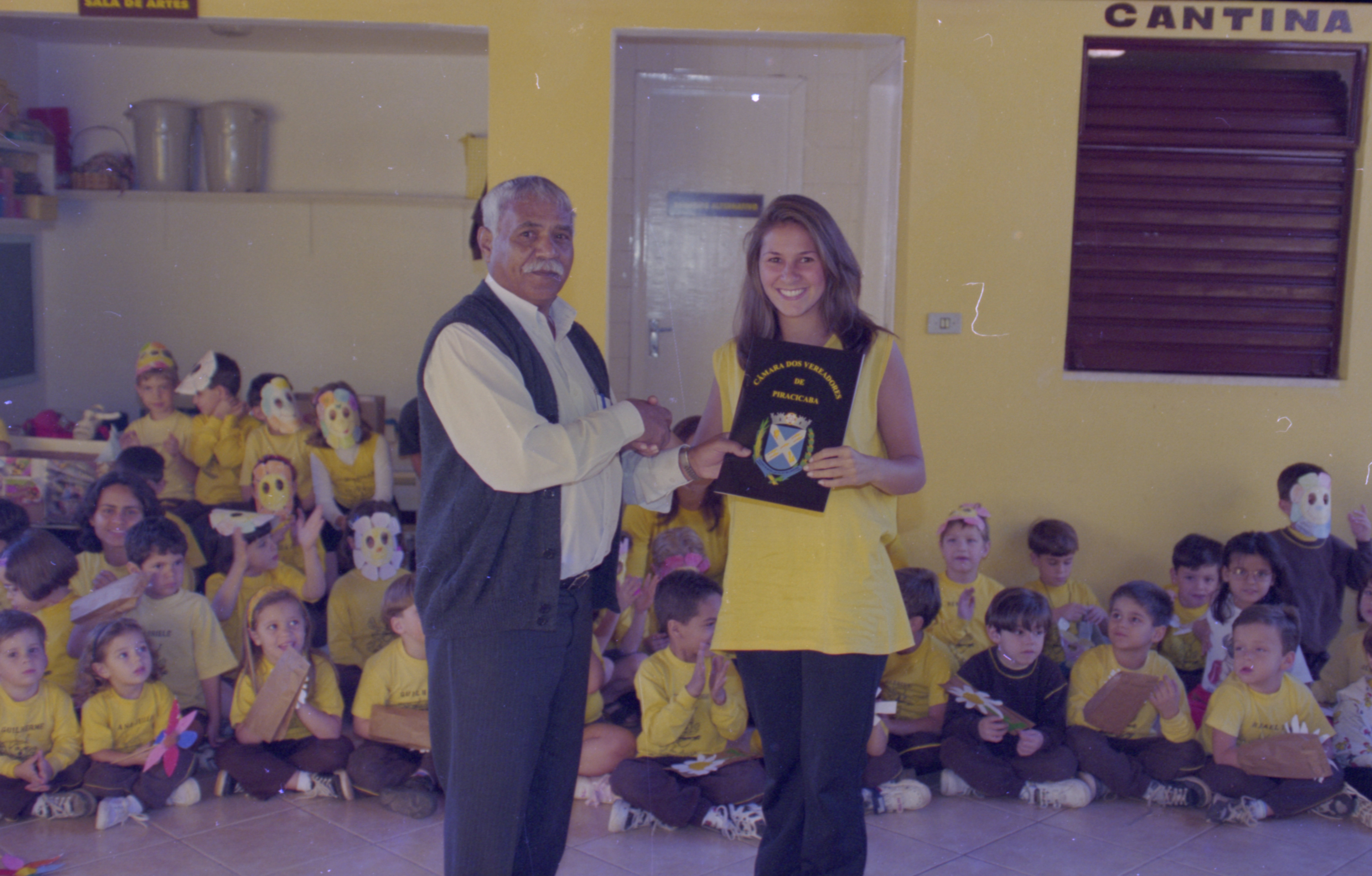 Iconografia que registra a entrega da Moção de Aplausos nº186/1999 à diretoria da Escola de Educação Infantil “A Cigarrinha”. A entrega teve lugar nas dependências da citada escola, com a presença do vereador Moacir Bento de Lima (Moacir Siqueira), autor da propositura.