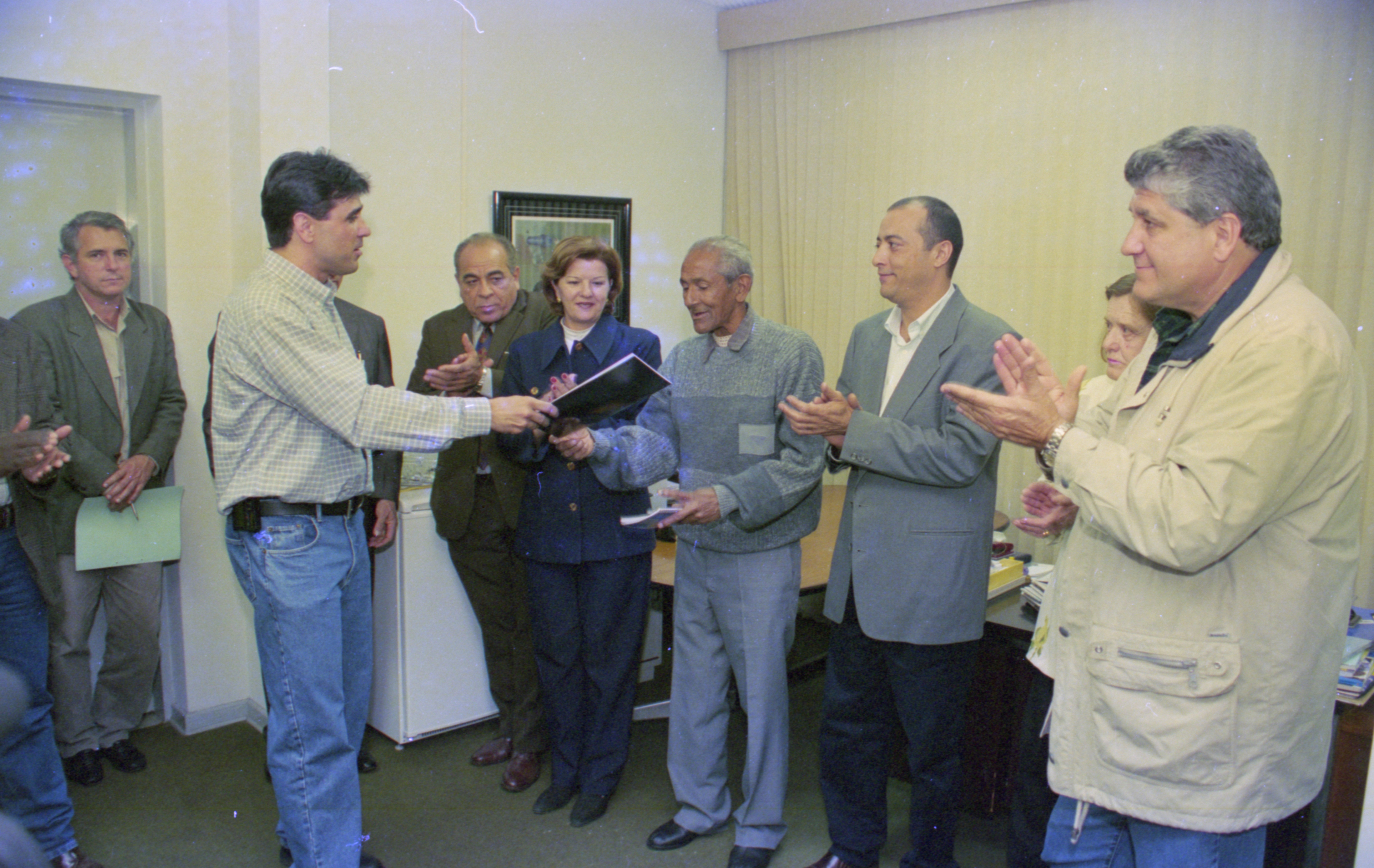 Iconografia que registra a entrega da Moção de Aplausos nº102/1999 ao Sr. Nordahl Christian Neptune e ao Sr. Elias Rocha, pelo lançamento do vídeo e exposição de fotos: “Os Bonecos do Elias dos Bonecos”. A entrega teve lugar na Câmara Municipal de Piracicaba, com a presença do vereador Ary de Camargo Pedroso Junior, autor da propositura, e de outros membros da edilidade.