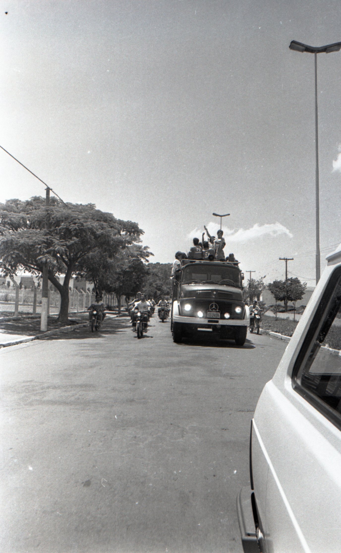 Na imagem, a delegação da Associação Desportiva da Unimep desfila pelas ruas de Piracicaba em um carro (caminhão) aberto do Corpo de Bombeiros.