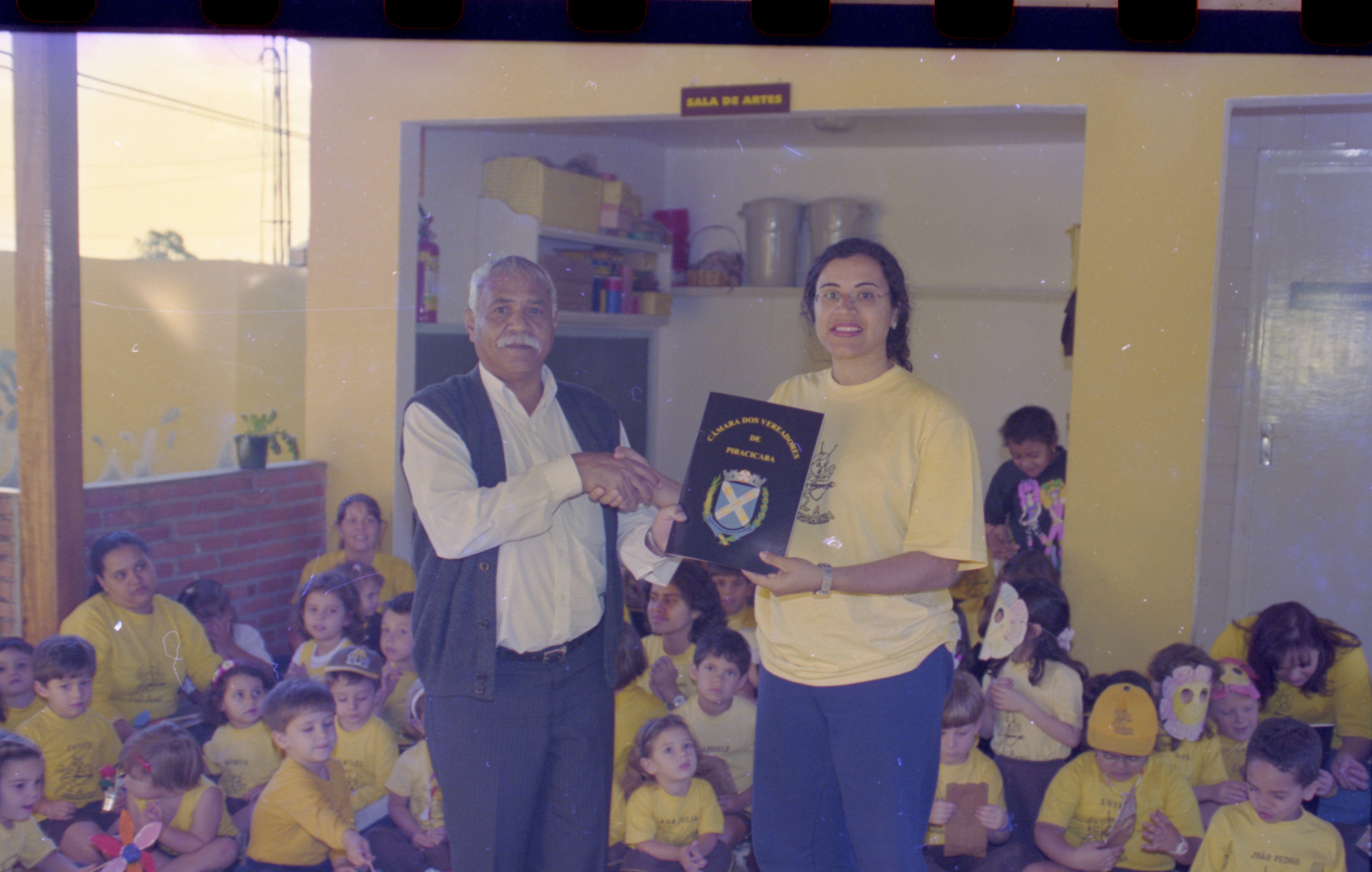 Iconografia que registra a entrega da Moção de Aplausos nº186/1999 à diretoria da Escola de Educação Infantil “A Cigarrinha”. A entrega teve lugar nas dependências da citada escola, com a presença do vereador Moacir Bento de Lima (Moacir Siqueira), autor da propositura.