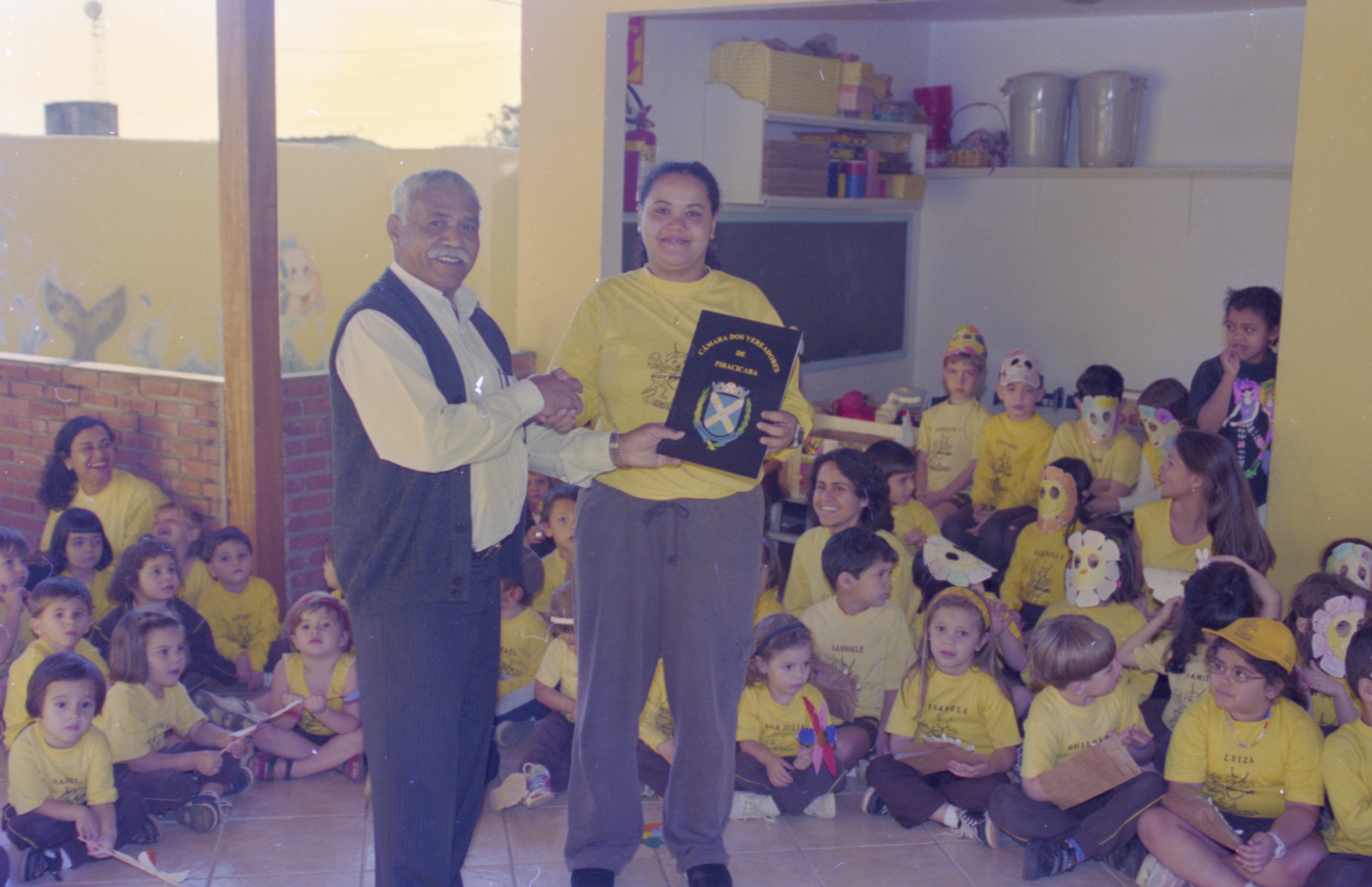 Iconografia que registra a entrega da Moção de Aplausos nº186/1999 à diretoria da Escola de Educação Infantil “A Cigarrinha”. A entrega teve lugar nas dependências da citada escola, com a presença do vereador Moacir Bento de Lima (Moacir Siqueira), autor da propositura.