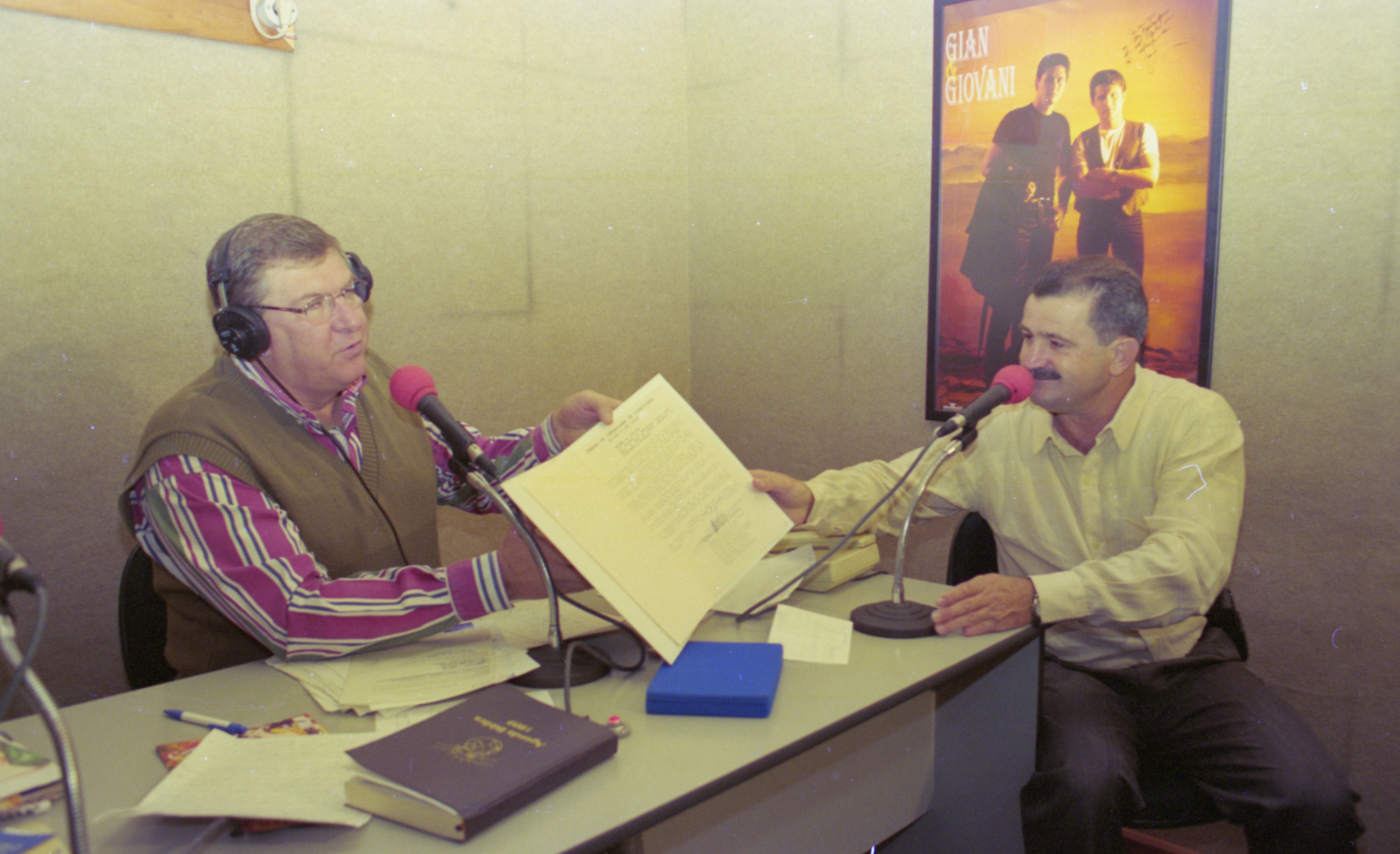 Iconografia que registra a entrega da Moção de Aplausos nº194/1999 ao radialista “Titio Luiz” pelos 24 anos de rádio, dedicados ao atendimento à população. A entrega teve lugar nas dependências da rádio, com a presença do vereador José Pedro Leite da Silva (Zé Pedro), autor da propositura.