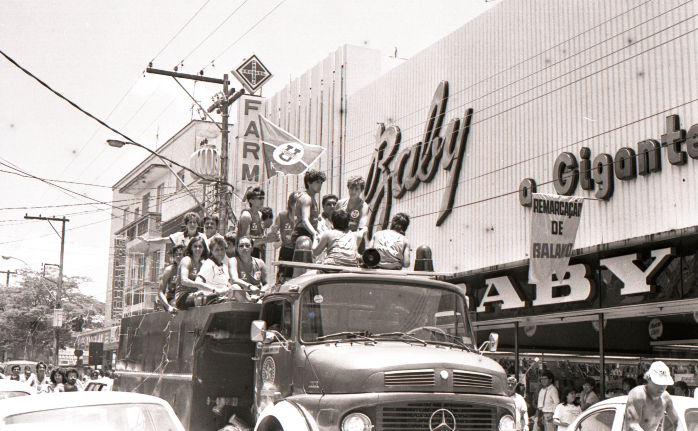 Na imagem, a delegação da Associação Desportiva da Unimep desfila pelas ruas de Piracicaba – mais precisamente na Rua Governador Pedro de Toledo - em um carro (caminhão) aberto do Corpo de Bombeiros. Identificam-se na foto: Maria Helena, Adalberto Maluf, Ana Fofão, Vânia Teixeira, Heleninha, Suka (fisioterapeuta), Vânia Hernandes, Paula, Mugão e Branca.