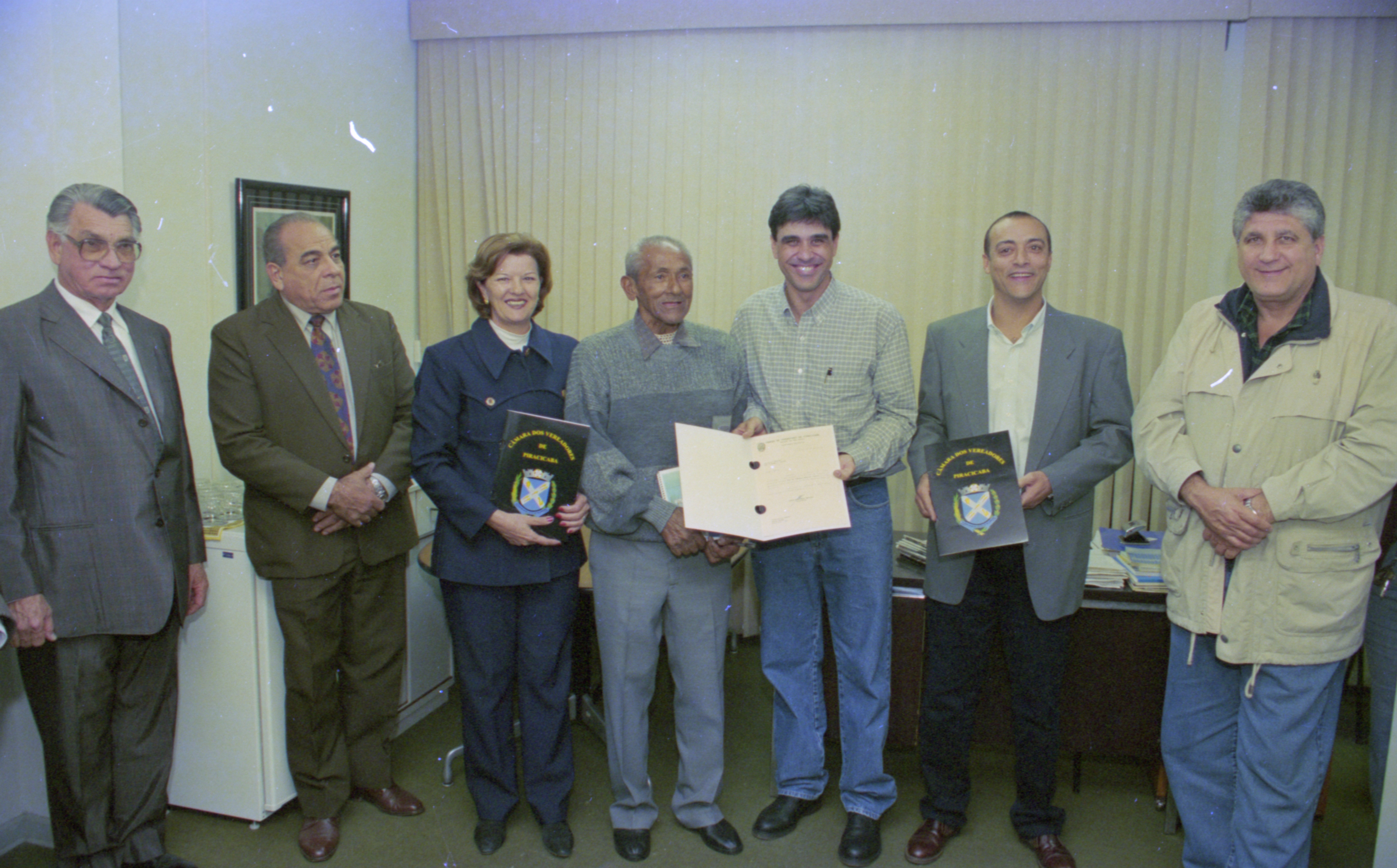 Iconografia que registra a entrega da Moção de Aplausos nº102/1999 ao Sr. Nordahl Christian Neptune e ao Sr. Elias Rocha, pelo lançamento do vídeo e exposição de fotos: “Os Bonecos do Elias dos Bonecos”. A entrega teve lugar na Câmara Municipal de Piracicaba, com a presença do vereador Ary de Camargo Pedroso Junior, autor da propositura, e de outros membros da edilidade.