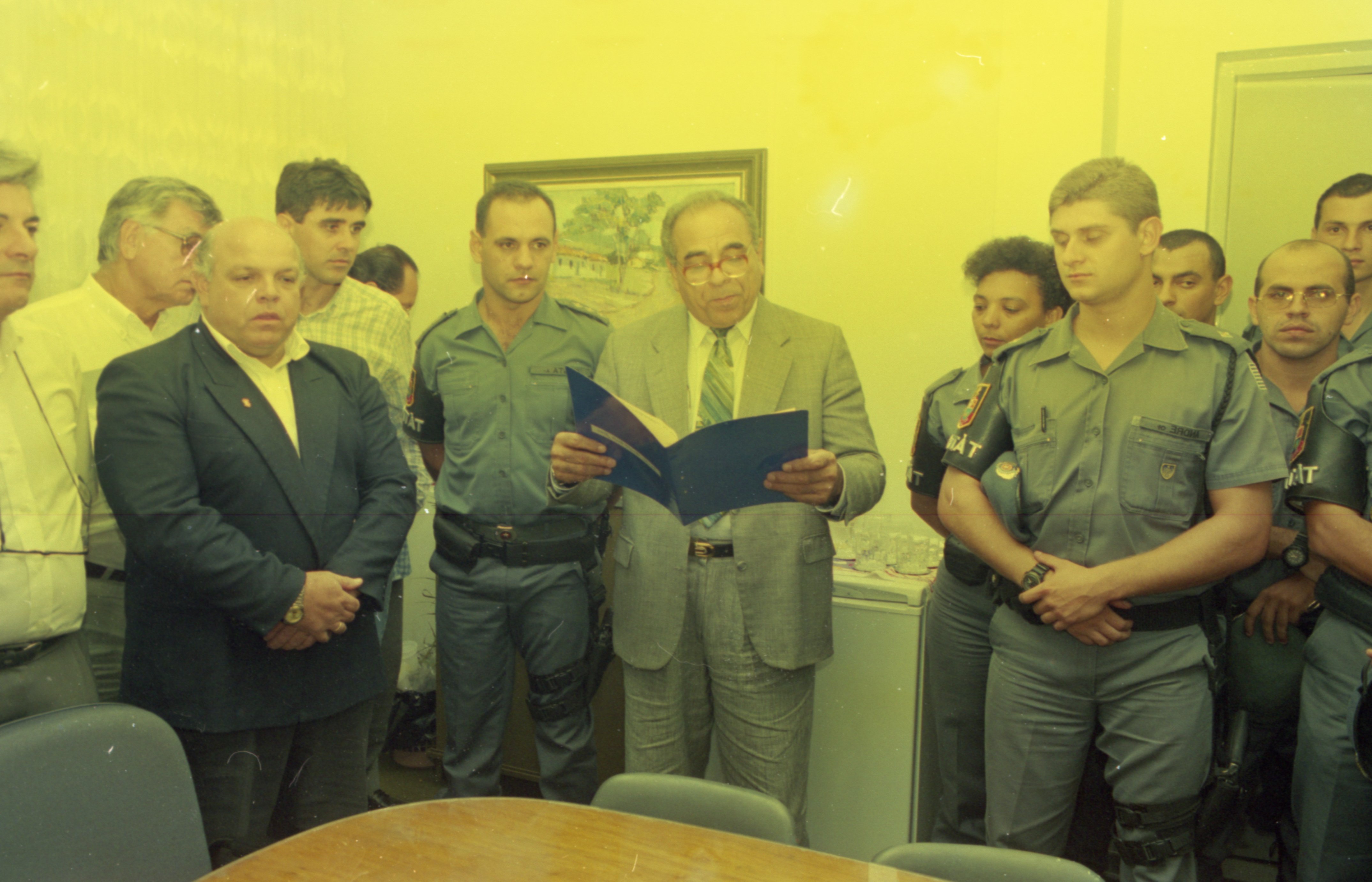 Iconografia que registra a entrega da Moção de Aplausos nº309/1997 ao Capitão Costa e sua equipe pelo excelente trabalho realizado na cidade de Rio das Pedras. A entrega teve lugar na então sala de reunião dos vereadores, com a presença do vereador João Leite de Oliveira, autor da propositura, e de outros membros da edilidade.
