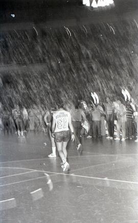 Fotografia que registra a disputa entre a Unimep (Piracicaba) e a Minercal (Sorocaba), na final do Campeonato Paulista Estadual de Basquete Feminino da Divisão Especial, realizada em 26 de janeiro de 1986, no ginásio do Ibirapuera (SP).