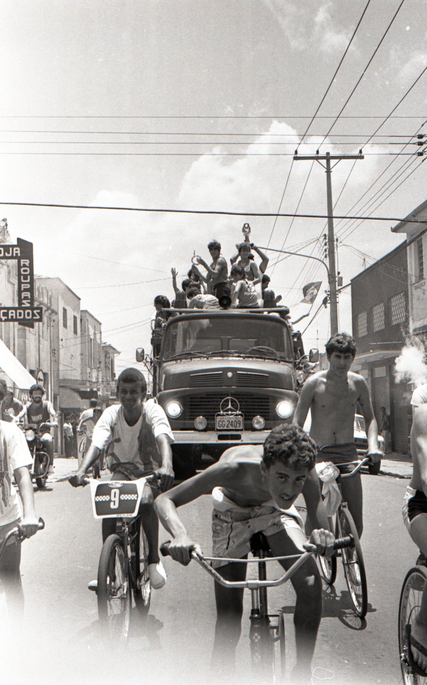 Na imagem, a delegação da Associação Desportiva da Unimep desfila pelas ruas de Piracicaba em um carro (caminhão) aberto do Corpo de Bombeiros.