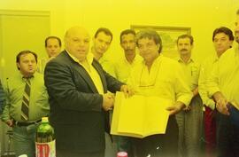 Iconografia que registra a entrega da Moção de Aplausos nº 1991/1997, a dupla Craveiro e Cravinho pela realização do show musical “Viola de Ontem – Viola de Hoje”. A entrega foi feita na então sala de reuniões dos vereadores da Câmara Municipal de Piracicaba e contou com a presença do vereador Ademar do Carmo Luciano Junior, autor da propositura, e de outros membros da edilidade, como: José Longatto, Egídio Mauro, João Manoel dos Santos e José Pedro Leite (Zé Pedro). Tércio Zen também está na foto (à esquerda, de gravata).