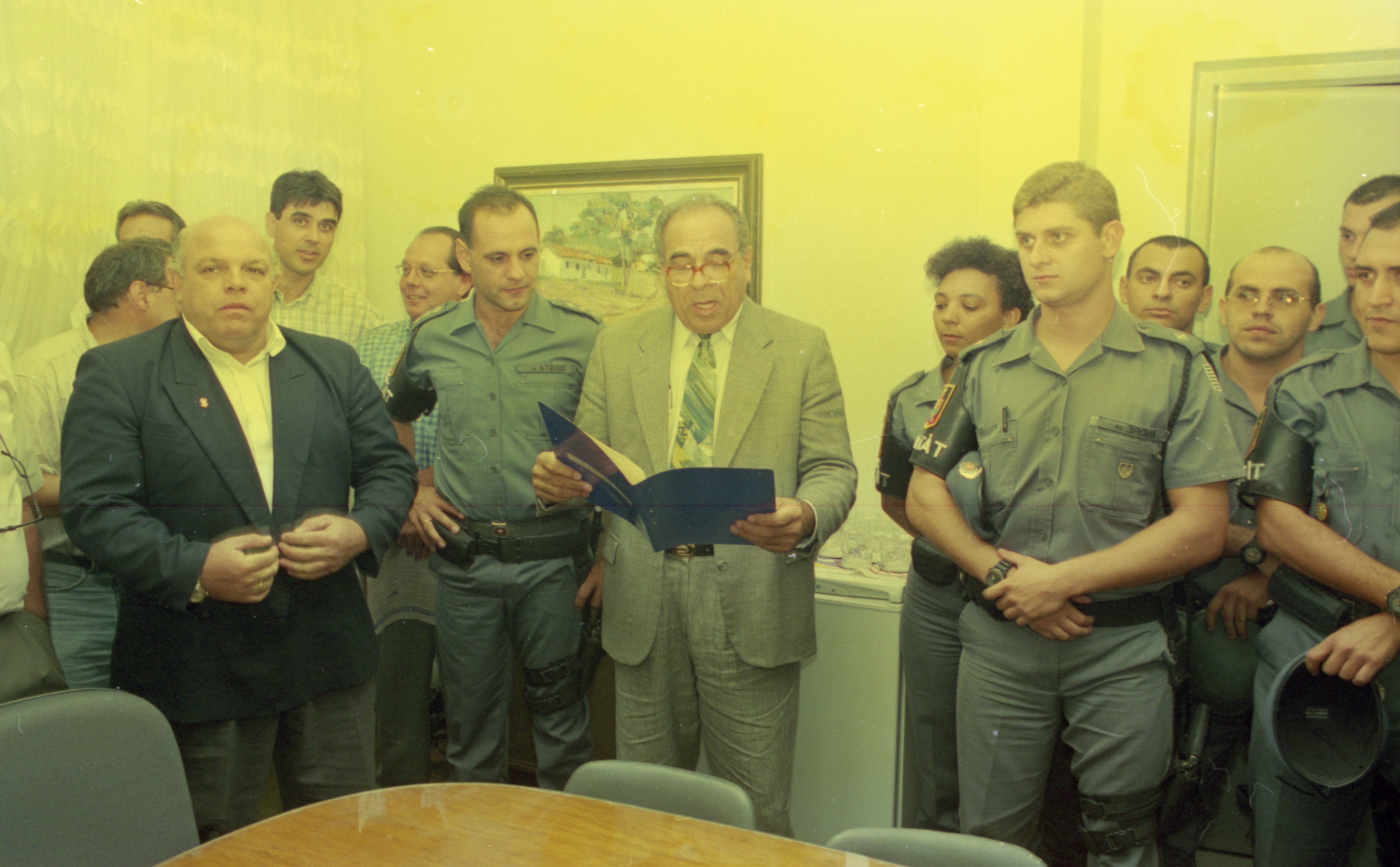 Iconografia que registra a entrega da Moção de Aplausos nº309/1997 ao Capitão Costa e sua equipe pelo excelente trabalho realizado na cidade de Rio das Pedras. A entrega teve lugar na então sala de reunião dos vereadores, com a presença do vereador João Leite de Oliveira, autor da propositura, e de outros membros da edilidade.