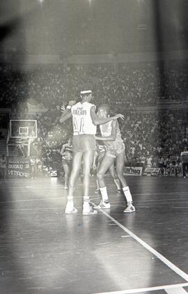 Fotografia que registra a disputa entre a Unimep (Piracicaba) e a Minercal (Sorocaba), na final do Campeonato Paulista Estadual de Basquete Feminino da Divisão Especial, realizada em 26 de janeiro de 1986, no ginásio do Ibirapuera (SP).