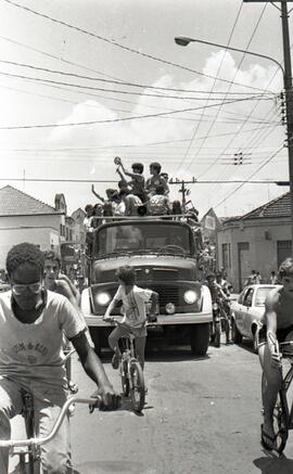 Na imagem, a delegação da Associação Desportiva da Unimep desfila pelas ruas de Piracicaba em um carro (caminhão) aberto do Corpo de Bombeiros.