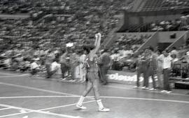 Fotografia que registra a disputa entre a Unimep (Piracicaba) e a Minercal (Sorocaba), na final do Campeonato Paulista Estadual de Basquete Feminino da Divisão Especial, realizada em 26 de janeiro de 1986, no ginásio do Ibirapuera (SP).