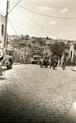 Na imagem, a delegação da Associação Desportiva da Unimep desfila pelas ruas de Piracicaba em um carro (caminhão) aberto do Corpo de Bombeiros.