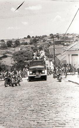 Na imagem, a delegação da Associação Desportiva da Unimep desfila pelas ruas de Piracicaba em um carro (caminhão) aberto do Corpo de Bombeiros.