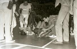 Na imagem, duas jogadoras estão deitadas na quadra, sendo uma delas Neusinha, que está sendo amparada pelo fisioterapeuta da equipe da Unimep, o Markão (ou Marcão - Antônio Marcos Augusto)