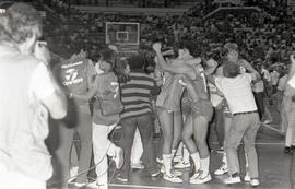Fotografia que registra a disputa entre a Unimep (Piracicaba) e a Minercal (Sorocaba), na final do Campeonato Paulista Estadual de Basquete Feminino da Divisão Especial, realizada em 26 de janeiro de 1986, no ginásio do Ibirapuera (SP).