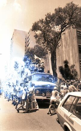 Na imagem, a delegação da Associação Desportiva da Unimep desfila pelas ruas de Piracicaba – mais precisamente na Rua Boa Morte, em um carro (caminhão) aberto do Corpo de Bombeiros.