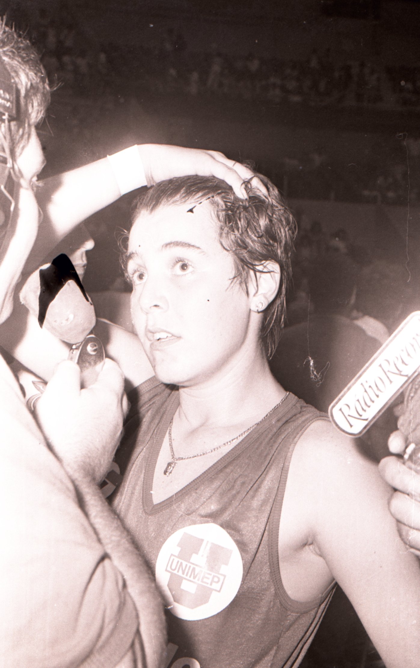 Fotografia que registra a disputa entre a Unimep (Piracicaba) e a Minercal (Sorocaba), na final do Campeonato Paulista Estadual de Basquete Feminino da Divisão Especial, realizada em 26 de janeiro de 1986, no ginásio do Ibirapuera (SP).