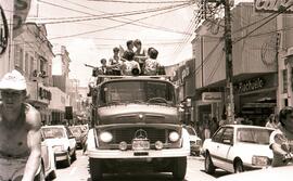 Na imagem, a delegação da Associação Desportiva da Unimep desfila pelas ruas de Piracicaba em um carro (caminhão) aberto do Corpo de Bombeiros.