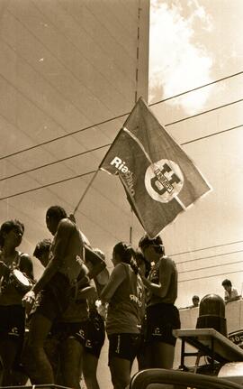 Na imagem, a delegação da Associação Desportiva da Unimep desfila pelas ruas de Piracicaba em um carro (caminhão) aberto do Corpo de Bombeiros. Em destaque, a bandeira da Unimep.