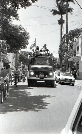 Na imagem, a delegação da Associação Desportiva da Unimep desfila pelas ruas de Piracicaba em um carro (caminhão) aberto do Corpo de Bombeiros.