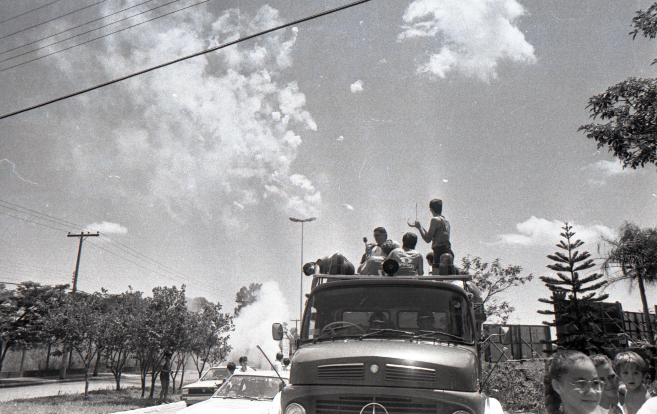 Na imagem, a delegação da Associação Desportiva da Unimep desfila pelas ruas de Piracicaba em um carro (caminhão) aberto do Corpo de Bombeiros.