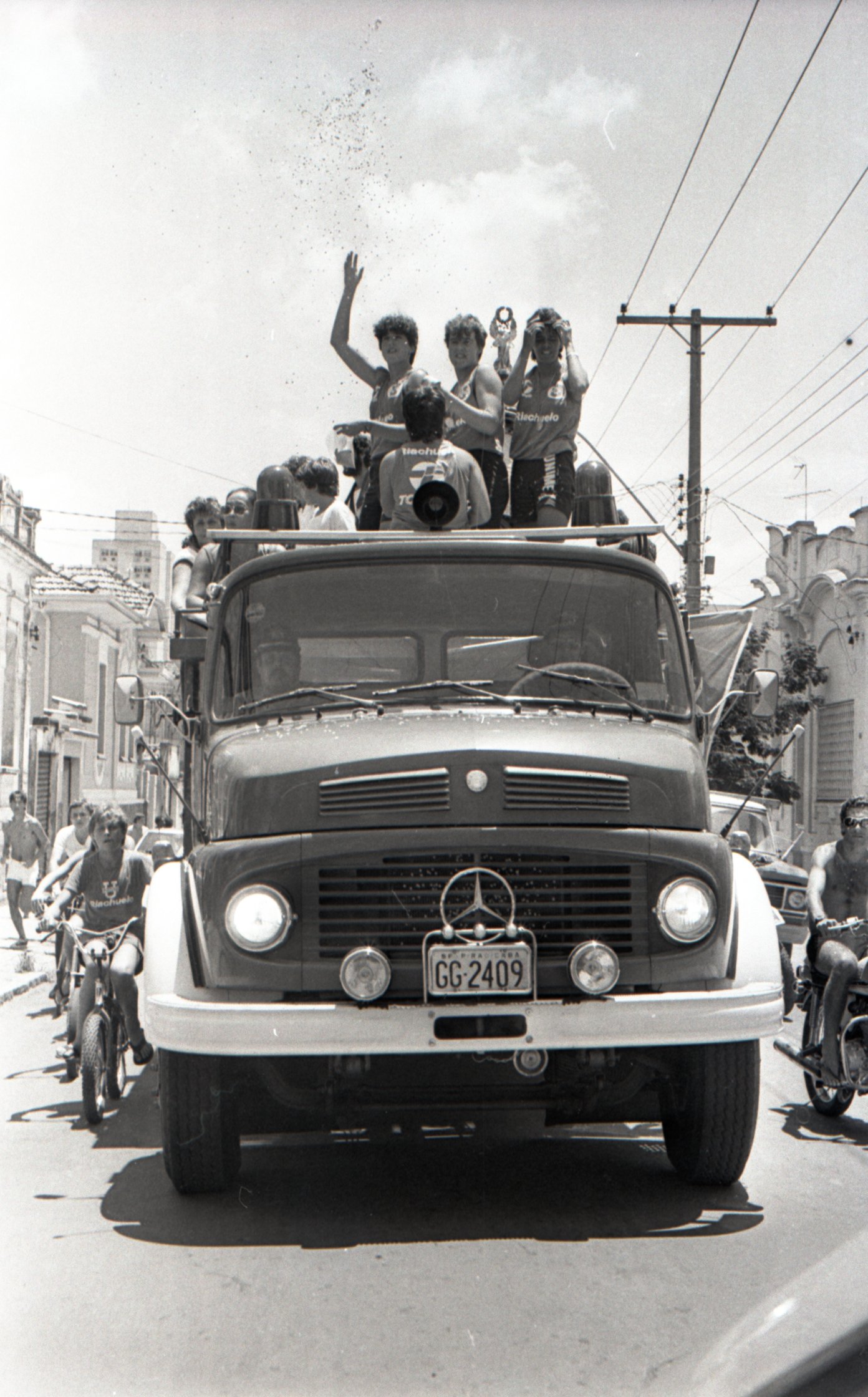 Na imagem, a delegação da Associação Desportiva da Unimep desfila pelas ruas de Piracicaba em um carro (caminhão) aberto do Corpo de Bombeiros. Identificam-se na fotografia: Maria Helena, Suka, Paula, Branca e Nádia.