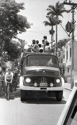 Na imagem, a delegação da Associação Desportiva da Unimep desfila pelas ruas de Piracicaba em um carro (caminhão) aberto do Corpo de Bombeiros.