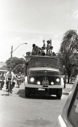 Na imagem, a delegação da Associação Desportiva da Unimep desfila pelas ruas de Piracicaba em um carro (caminhão) aberto do Corpo de Bombeiros.