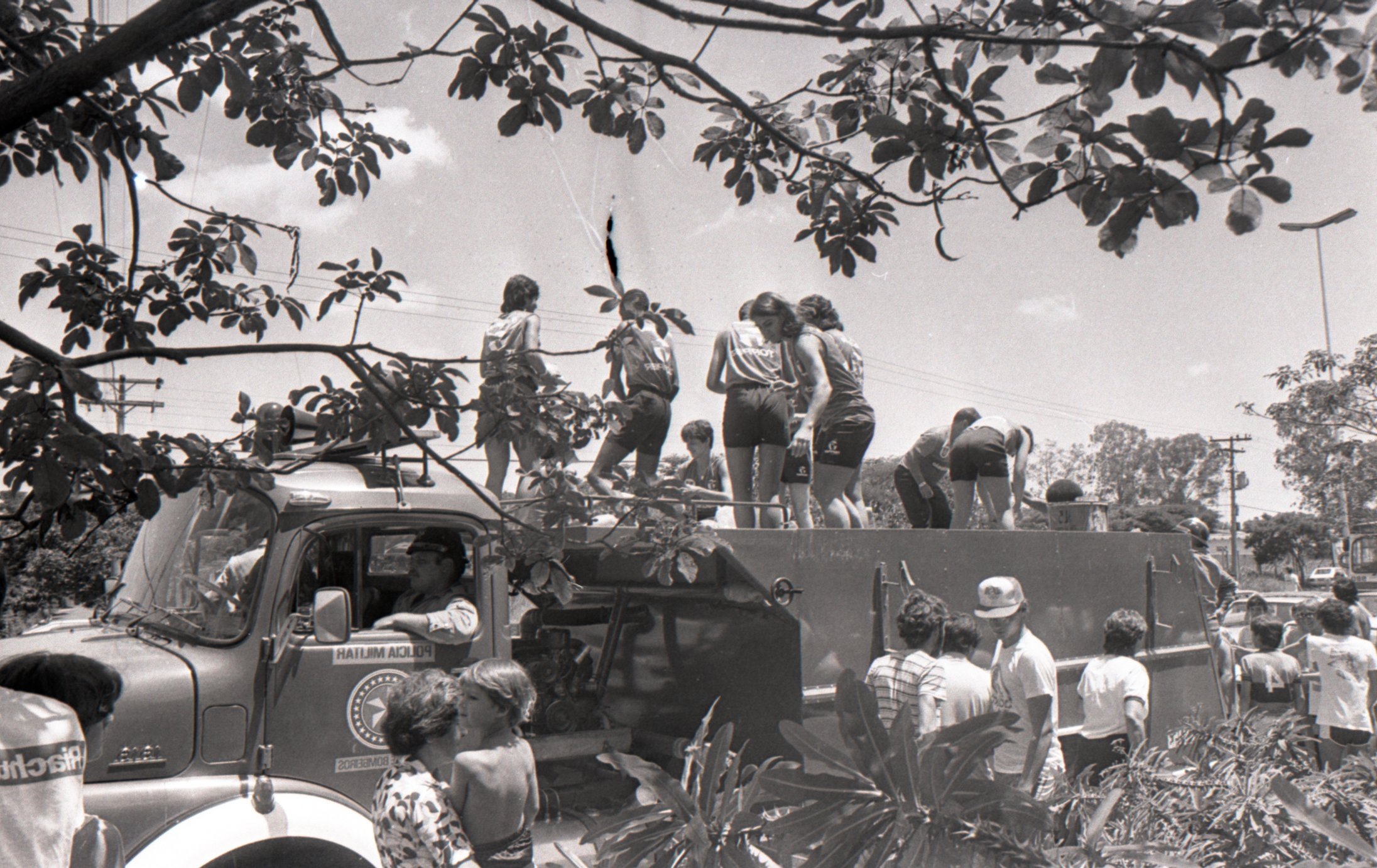 Na imagem, a delegação da Associação Desportiva da Unimep desfila pelas ruas de Piracicaba em um carro (caminhão) aberto do Corpo de Bombeiros.