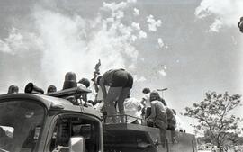 Na imagem, a delegação da Associação Desportiva da Unimep desfila pelas ruas de Piracicaba em um carro (caminhão) aberto do Corpo de Bombeiros.